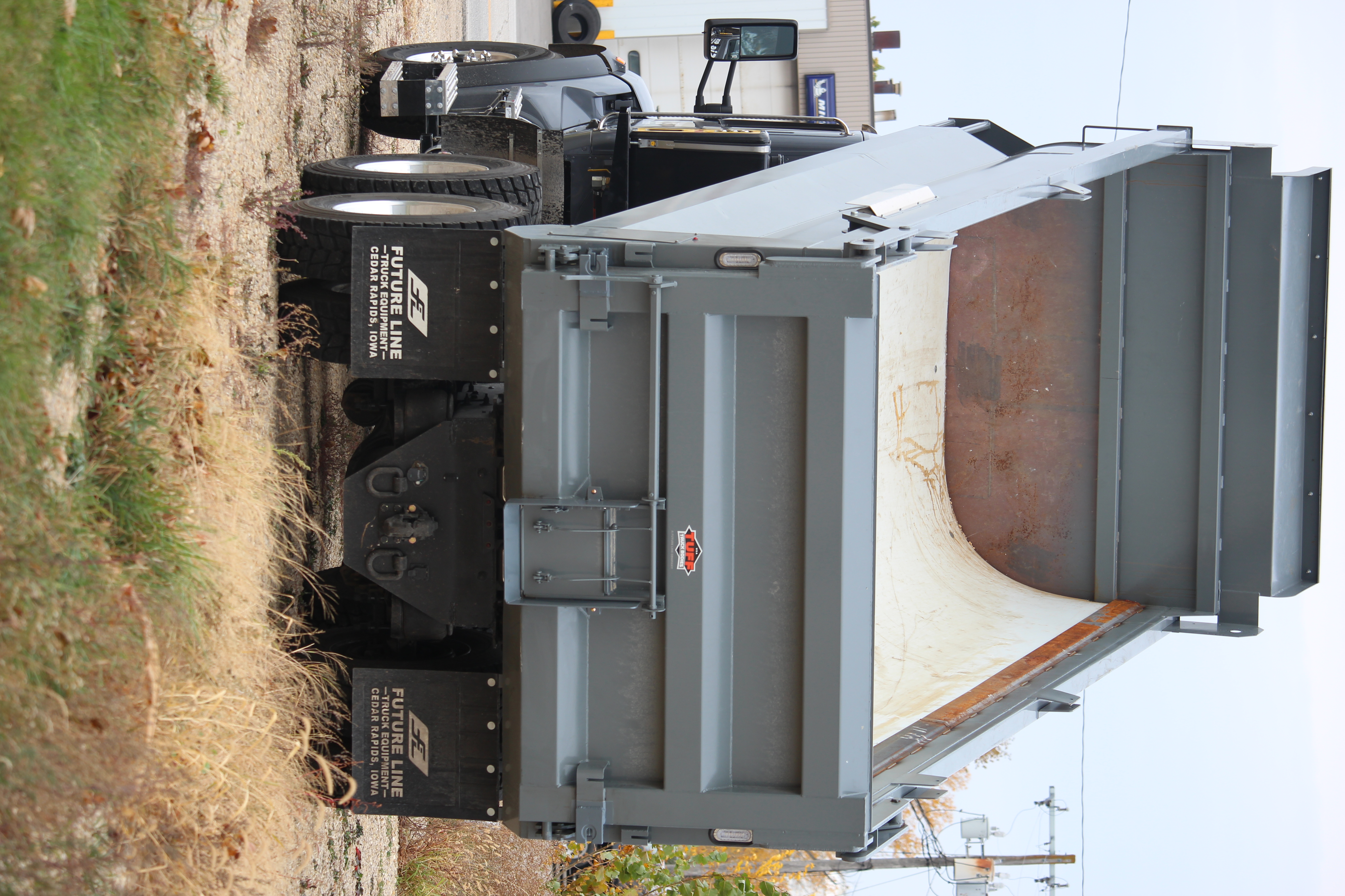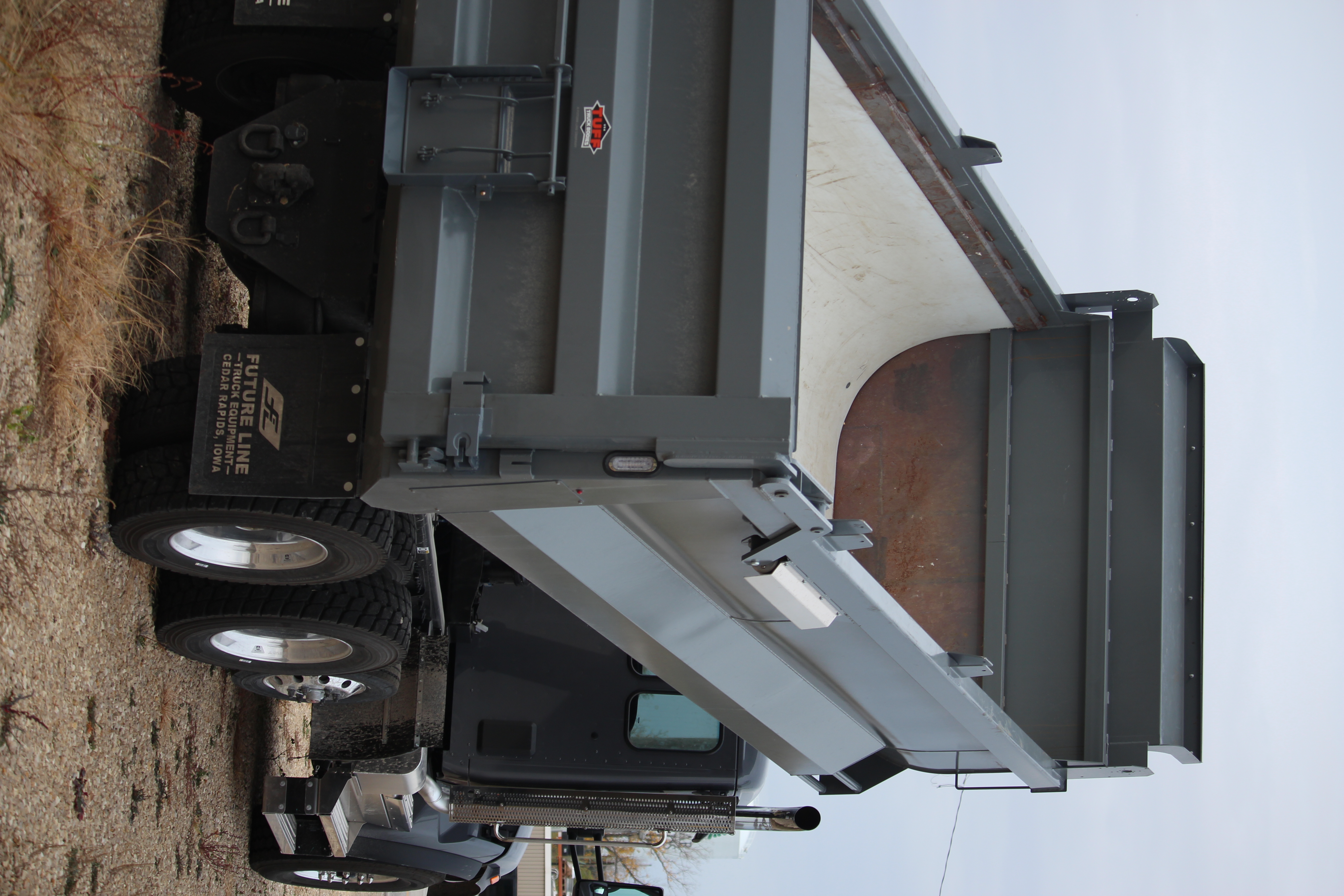 Tuff Truck Bodies also manufactures a robust Steel Class 8 Dump Body. These bodies are constructed from AR450 Hardox 4mm steel for the front, tub, and tailgate, with 10 ga. fenders and step. The design includes 1/4" x 2" x 8" long sills, 1/4" x 4" x 4" crossmembers, and a 4" x 6" top rail. Features consist of Hyva hoists with an external doghouse, dual air cylinder tailgate latches, a 1-piece wire harness with Deutsch connectors, and 5-in-1 tail lights. These steel dump bodies are sand-blasted, zinc-coated, and powder-coated to customer specifications and are designed to be strong and long-lasting.