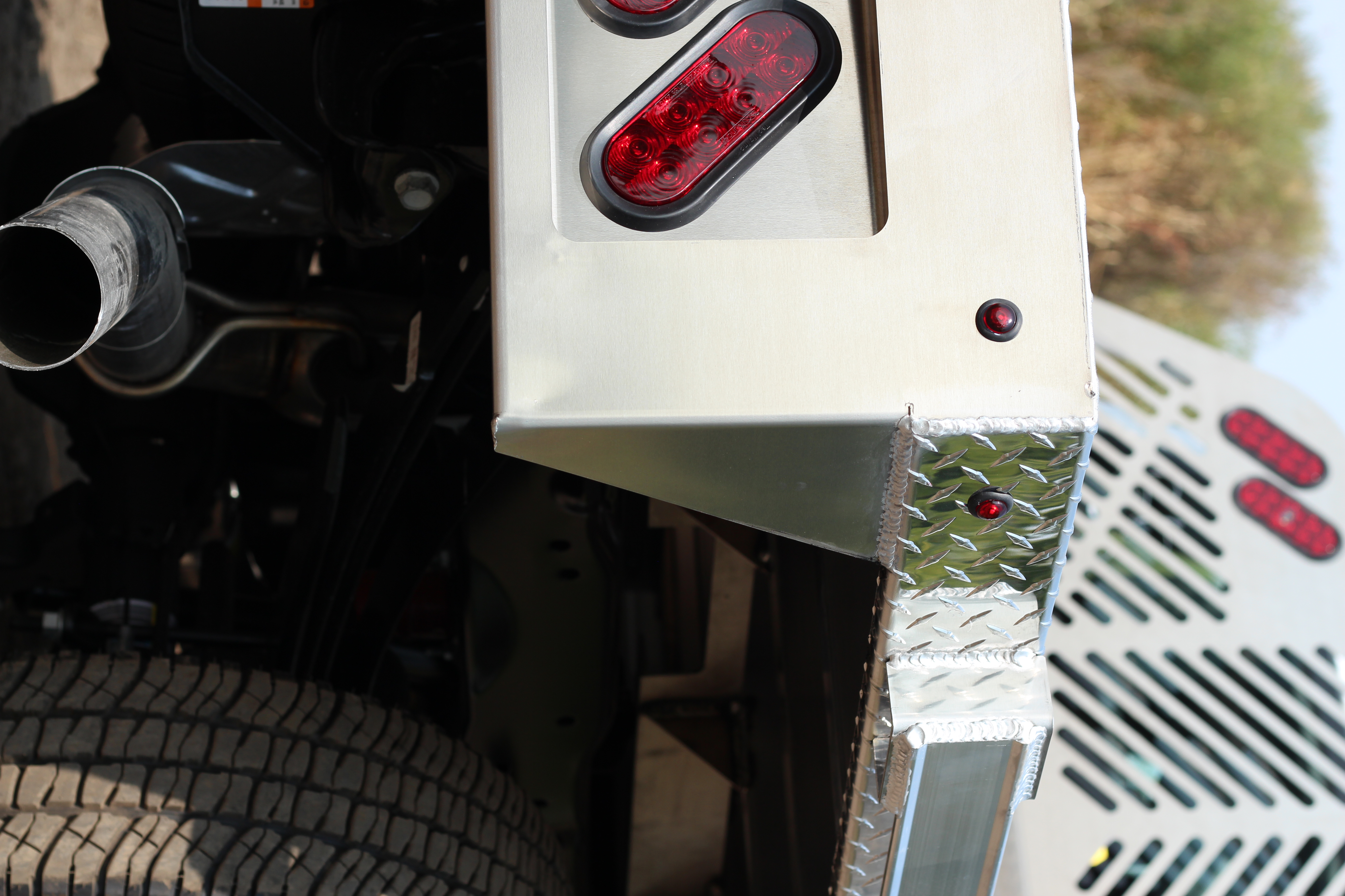 The FDS Rancher body, manufactured by Tuff Truck Bodies, is constructed entirely from aluminum, using their proprietary T6061 aluminum alloy extrusions for 100% corrosion resistance, strength, durability, and longevity. It features a 6" x 4" extruded rub rail, 4" drop-down sides with a drop-in rear, and recessed D-rings, along with a boxed 1 ¾" extruded aluminum floor with a smooth bottom. The body also includes a proprietary EX2 long sill rubber cushion insert, a 1/8" tread aluminum chamfered rear apron with LED lights, and a gooseneck hitch with a 25,000-lb ball.